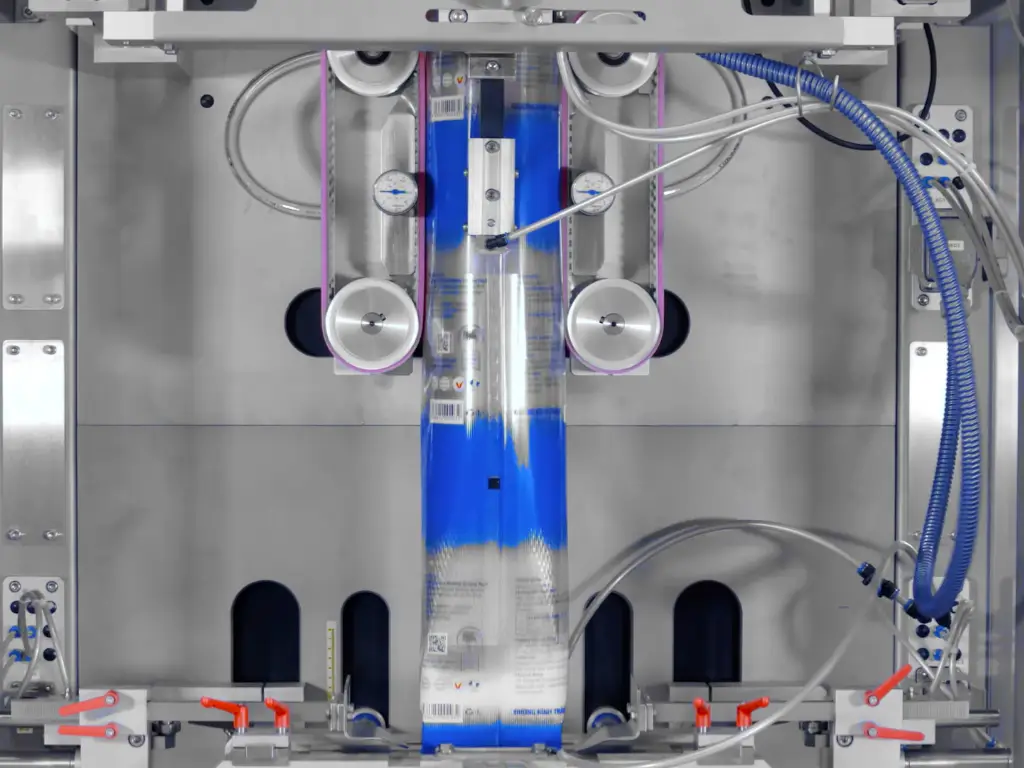 - VFFS (Vertical Form Fill Seal): Envision a roll of plastic film. The machine pulls it down with a friction belt, forms the film into a tube, seals the bottom, drops a portioned product in from a multi-head weigher, and seals the top. The vertical alignment allows the entire system to drop product into the bag using the force of gravity as is common practice for products like potato chips and coffee beans.